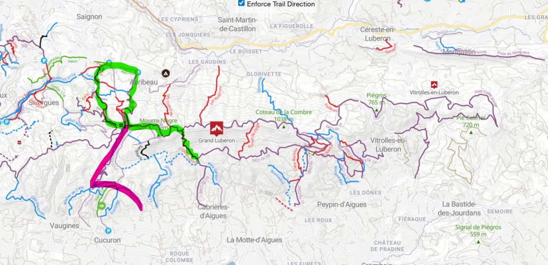 Et si 2 voitures avec un peu de place, pourquoi pas manip voiture (30min de route) pour aller 1j sur le Grand Luberon, avec la DFCI pentue qu'on a déjà fait il y a quelques années au départ du sud, puis descendre au nord par La Femme Morte pour remonter au Mourre Nègre et revenir face sud.