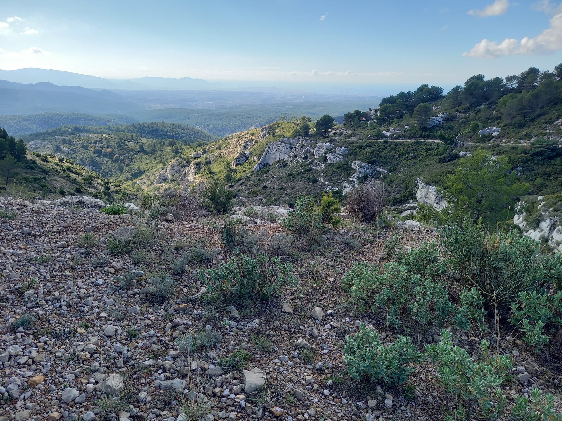 Descente cassante qui va bien puis on remonte une looongue DFCI qui nous amène à la vigi. On y déjeune dans le froid car un nuage nous cache du soleil...