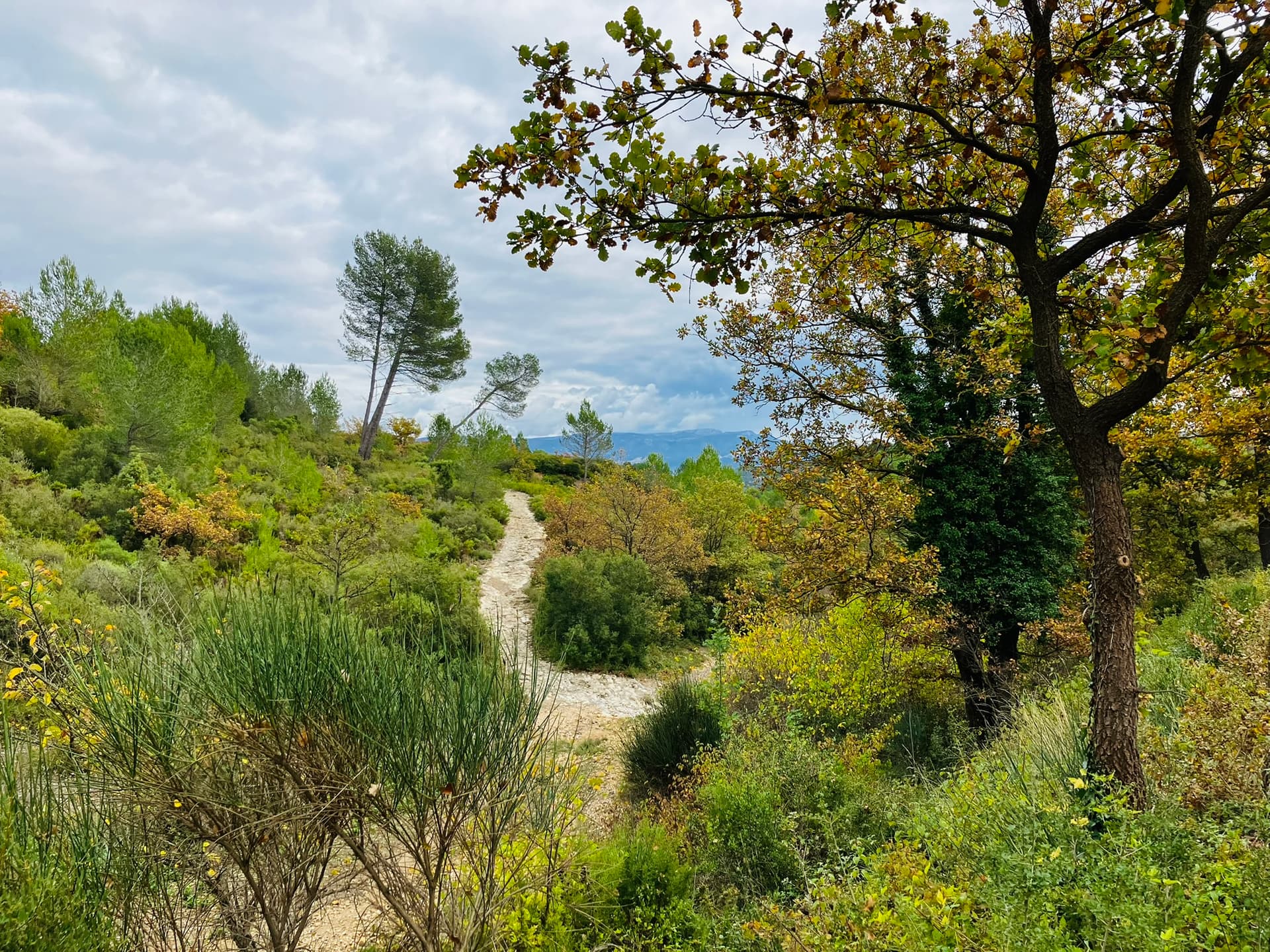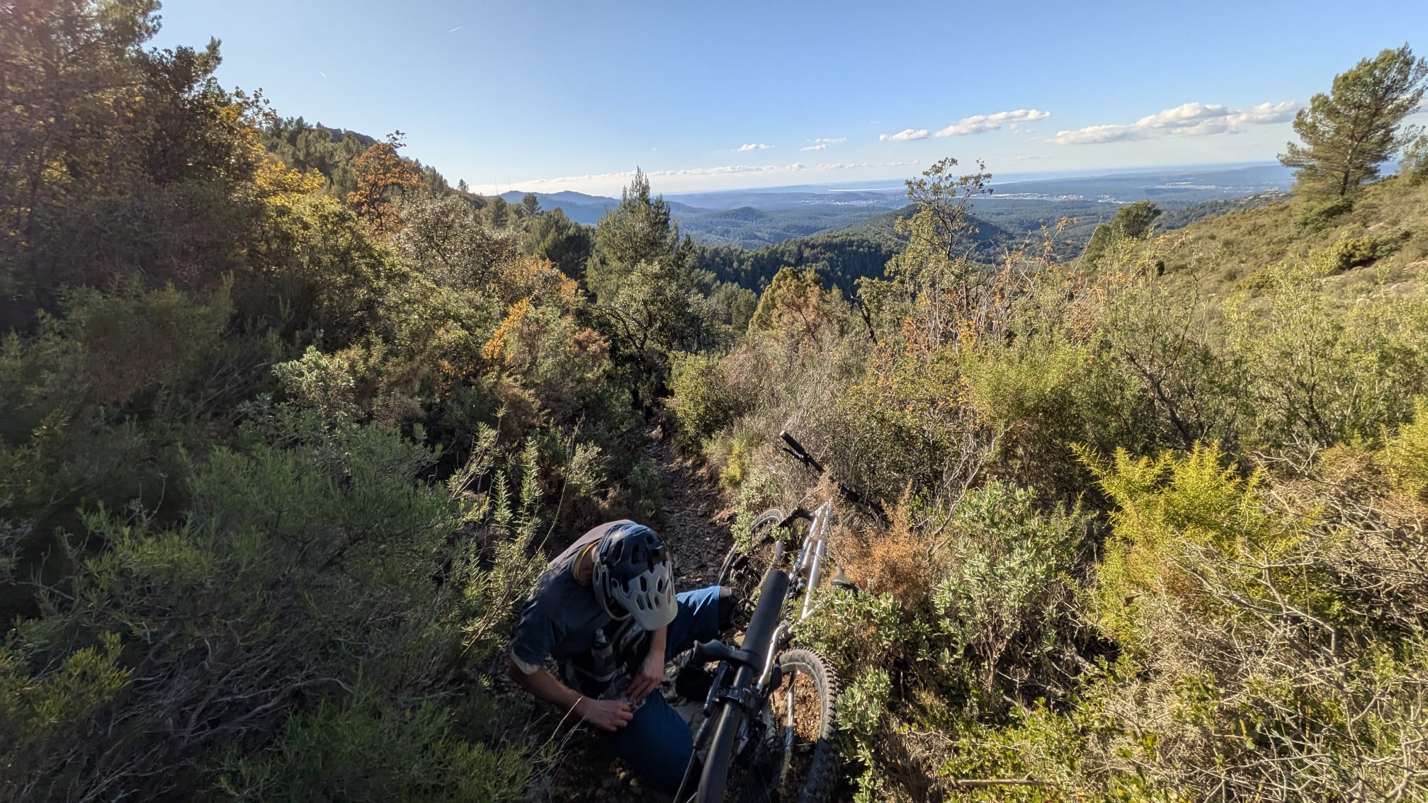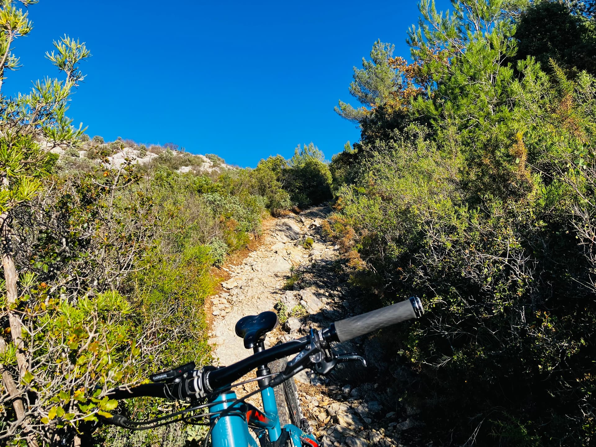 Le parcours s'intitule : les sentiers de Gréasques. Ce que je peux dire c'est qu'il porte bien son nom. Quasi pas de piste et surtout du sentier, du monotrace et encore du sentier. ça tourne dans tous les sens et il y en a partout. Presque trop. J'ai un oeil destiné à donner l'ordre aux bras de tourner le guidon dans le bon sens et l'autre rivé sur le GPS pour vérifier que le premier prenne la bonne direction.