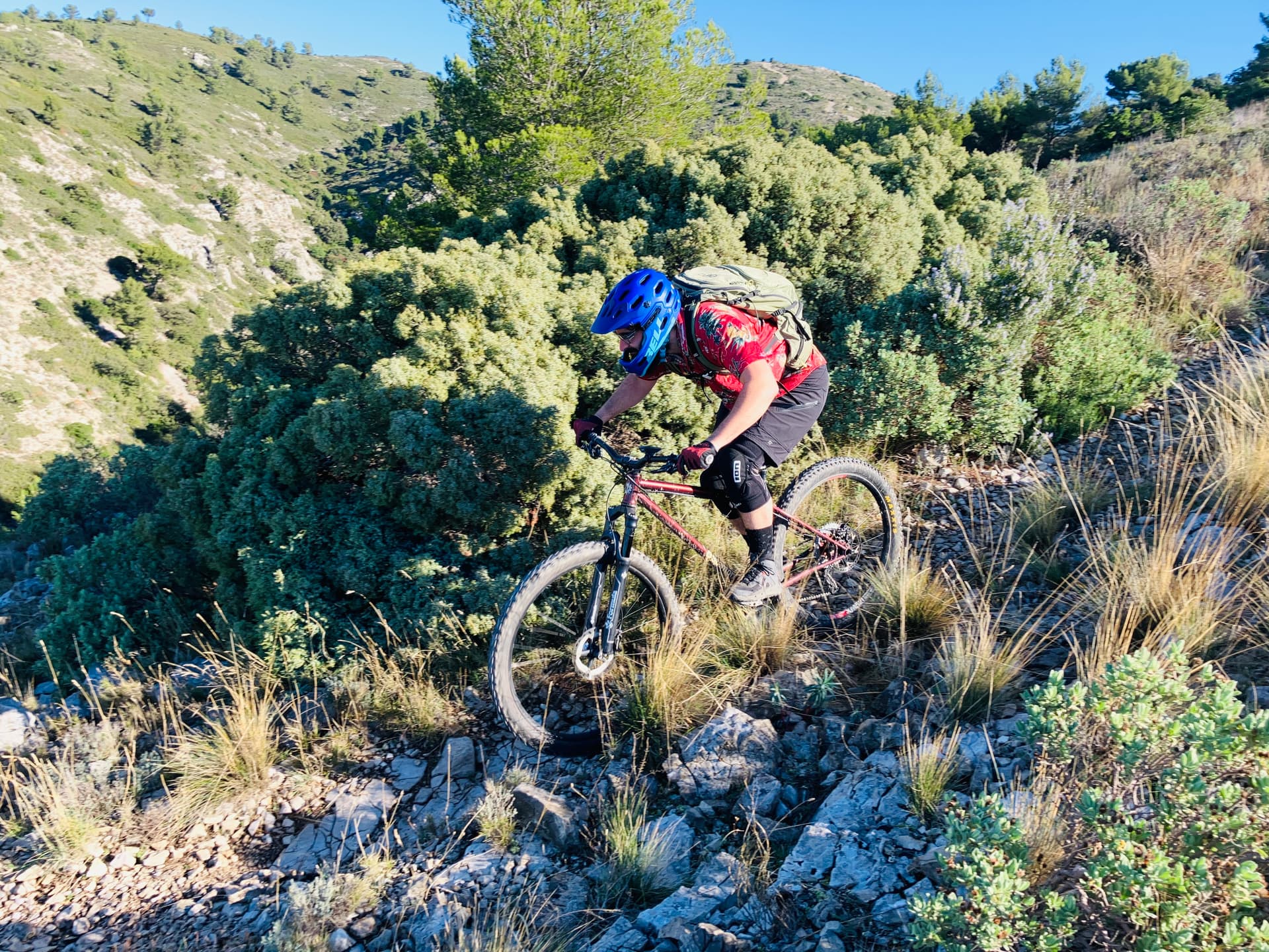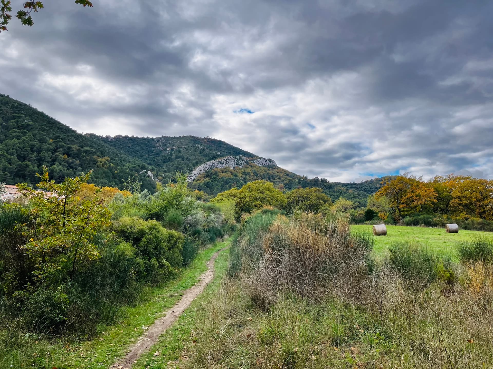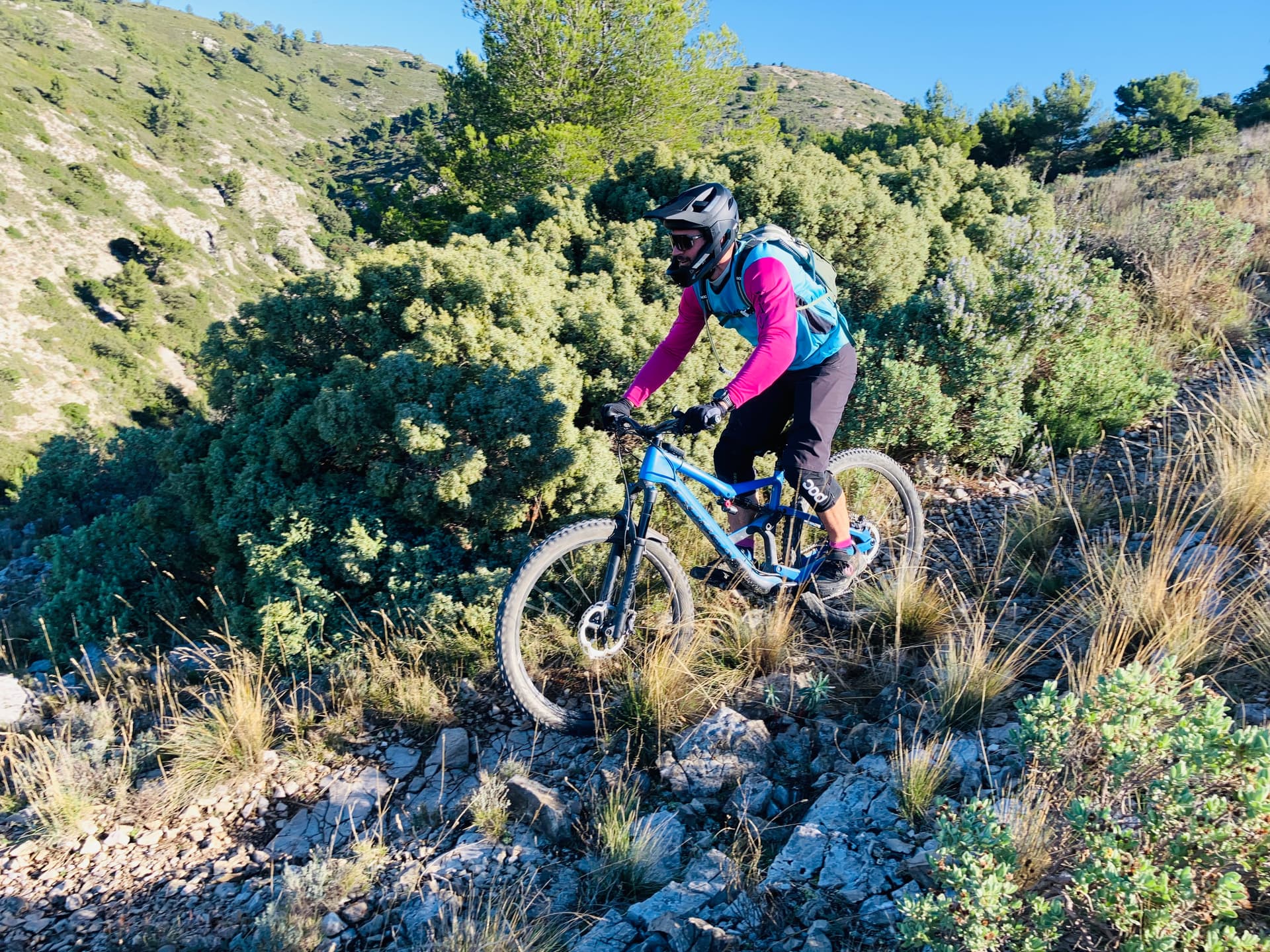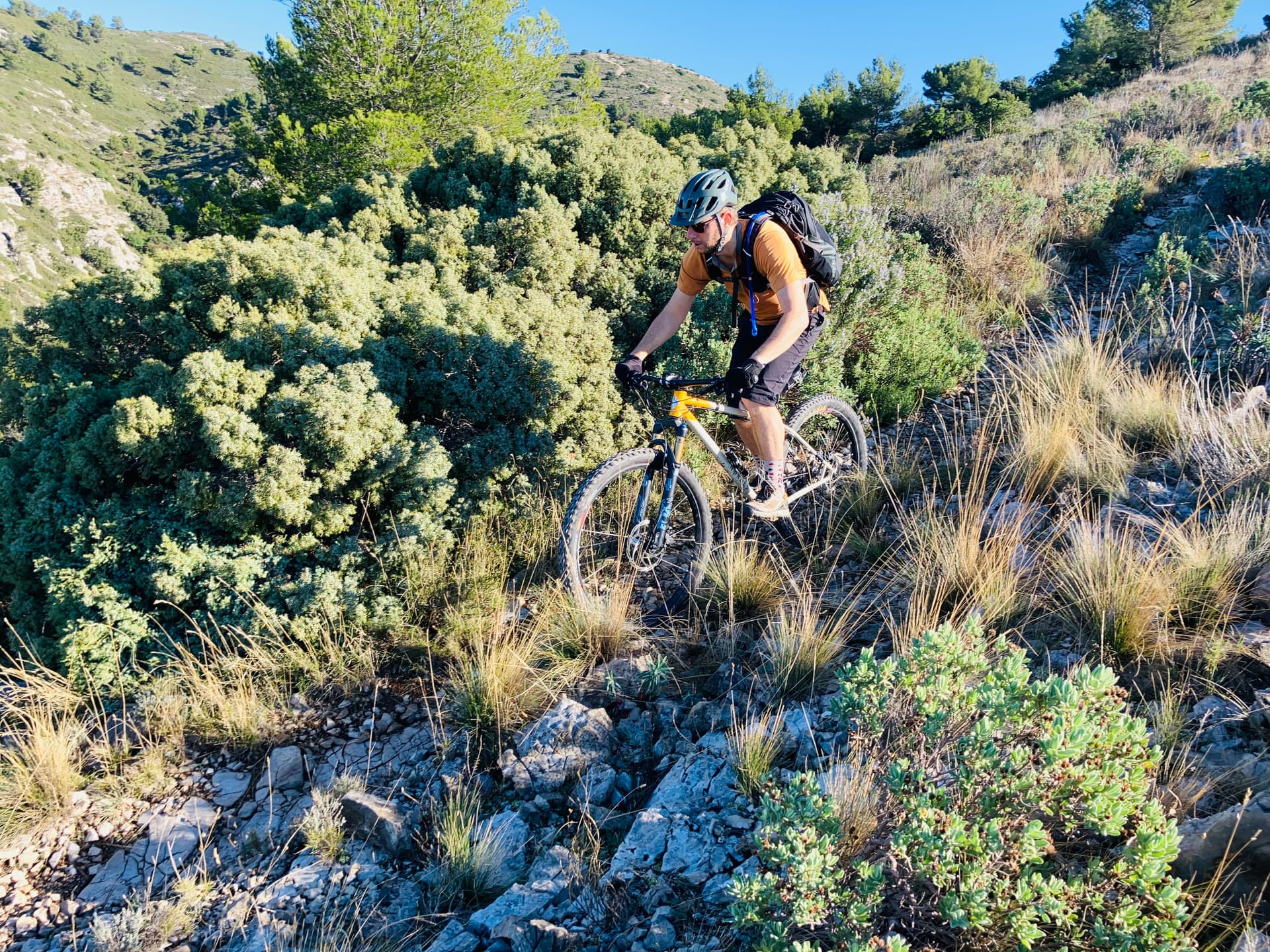 Le parcours s'intitule : les sentiers de Gréasques. Ce que je peux dire c'est qu'il porte bien son nom. Quasi pas de piste et surtout du sentier, du monotrace et encore du sentier. ça tourne dans tous les sens et il y en a partout. Presque trop. J'ai un oeil destiné à donner l'ordre aux bras de tourner le guidon dans le bon sens et l'autre rivé sur le GPS pour vérifier que le premier prenne la bonne direction.