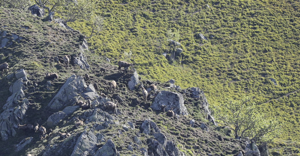 Environ 25 chamois (dont 10 cabris de l'année) sous le Hohneck (une cinquantaine en tout au lever du jour sur le secteur)