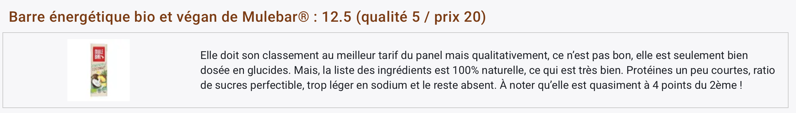 Il y a de nombreux fans des bars MuleBar par ici. Je viens de regarder le comparatif des barres de Nicolas Aubineau, qui fait des classements de barres, de gels, de boissons pour le sport depuis une dizaine d'années. Il ne s'intéresse pas au goût, mais à la composition et au prix.