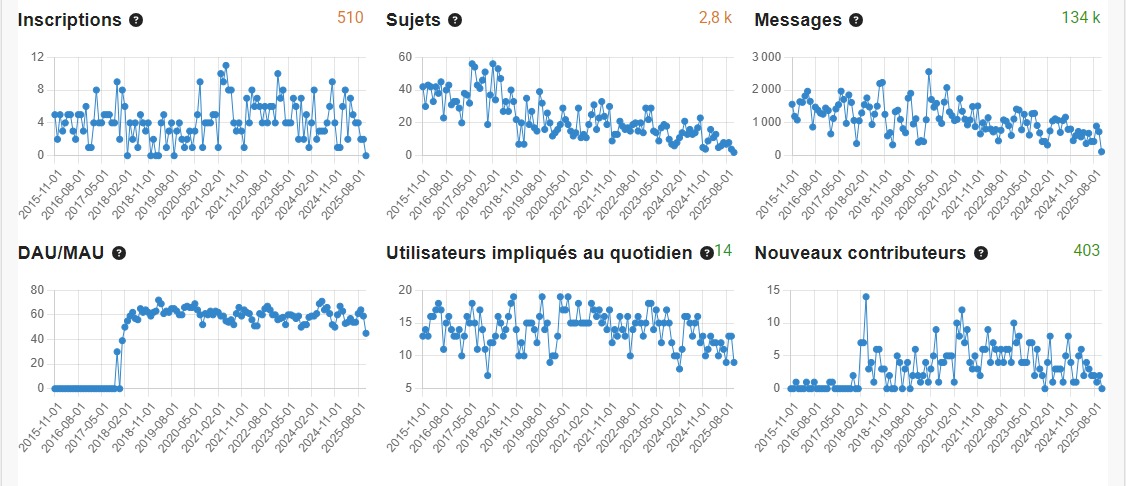 Pour continuer la discussion commencée à l’AG, je viens d’aller regarder les stats du forum sur 10 ans. J’y vois une érosion lente depuis 2020/2022 en gros :