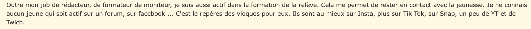 Dans le sens où sur le net, de plus en plus, je trouve qu’une réponse de qualité à une question c’est plutôt sur un forum qu’on la trouve (vu le nombre de sites auto-générés via des IA qui sont en train de pourrir le net).