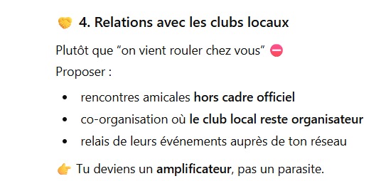 Concernant l'assurance, après lecture de ce fil l'IA préconise que les sorties VTT ne soient pas des sorties officielles mais des sorties proposées par un membre et annoncées comme sorties informelles entre particuliers sous responsabilité de chacun.