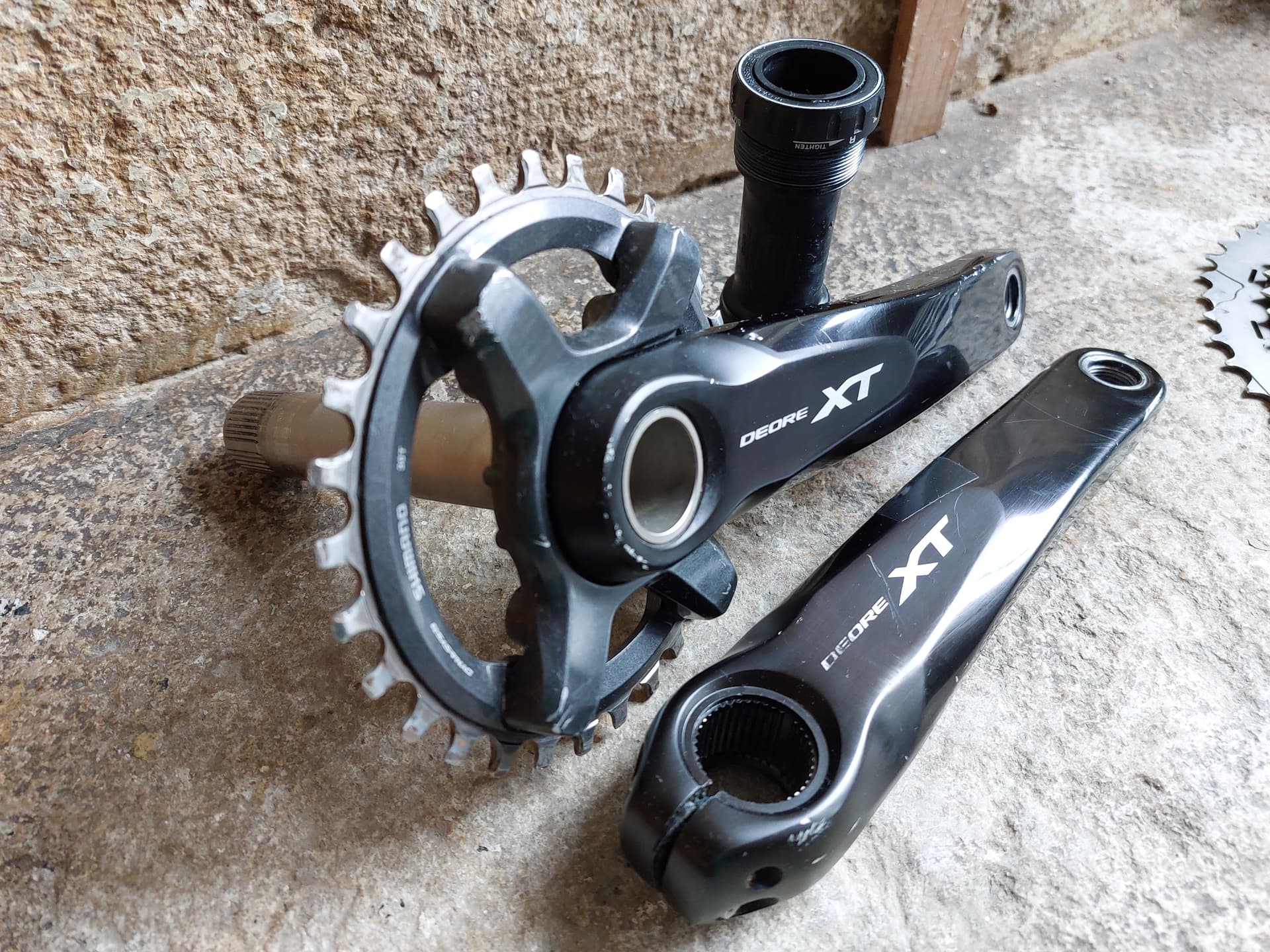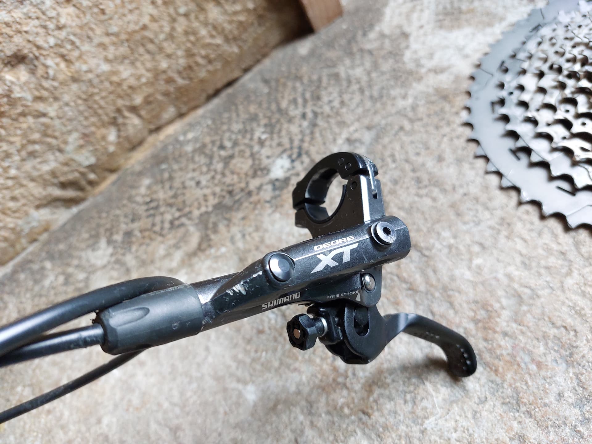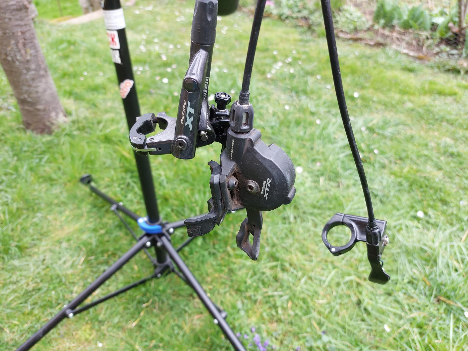Freins XT M8000, l'arrière sera à purger/reconnecter je donnerai un ptit kit. Les leviers sont un peu griffés mais ça va.